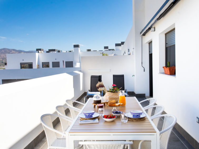 Torre del Mar: Modernes, schönes, komfortables Appartementhaus "Atico Maroma", auf 5 Stockwerken. Torre del Mar, 500 m vom Meer, 500 m vom Strand, Richtung Norden. Zur Mitbenutzung: Schwimmbad (15 x 7 m, 35 - 150 cm tief, saisonale Verfügbarkeit: 01.Jun. - 30.Okt.). WC im Poolbereich, Aussendusche. Im Hause: Fahrstuhl, Klimaanlage, Waschmaschine. Parkplatz Nr. 14 (überdacht), Einzelgarage. Einkaufsgeschäft, Lebensmittelgeschäft 300 m, Einkaufszentrum 1.5 km, Restaurant, Bäckerei, Café 300 m, Fußgängerzone 700 m, Bushaltestelle 50 m, Bahnstation 25 km, Fähre 23 km, Sandstrand 500 m. Sporthafen 2 km, Jacht-Hafen 2 km, Golfplatz (18 Loch) 4 km, Segelschule 700 m. Nahe gelegene Sehenswürdigkeiten: Nerja, La Viñuela, Periana, Malaga, Granada, Frigiliana. Bekannte Skigebiete sind gut erreichbar: Sierra Nevada. Wandergebiete: Sierra Tejeda, Sierra Almijara. Bitte beachten: Babyausstattung (inkl.). Der Besitzer akzeptiert keine Jugendgruppen. Be- und Entladen am Ferienhaus möglich. Ferienwohnung Ref. ES5460.1.1 befindet sich auf dem gleichen Grundstück.